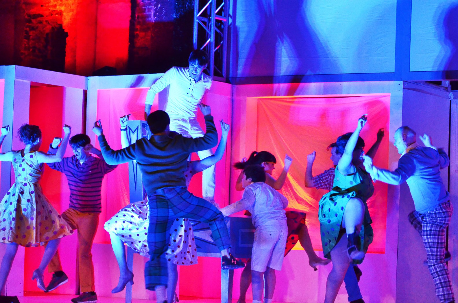 JJ Parkey as pinball wizard Tommy (center) revels in the adulation of his dancing fans while Griffin Giannone, as his 10-year-old self, racks up a score at the pinball machine in The Who’s Tommy (photo by Heather Wack)