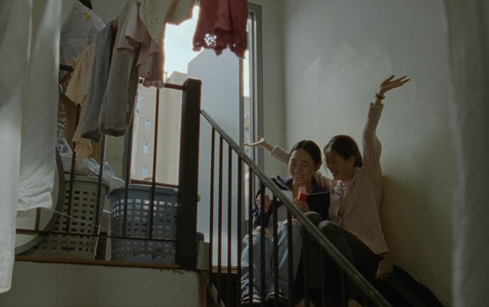 Immigrants and massage parlor workers Amy (Ke-Xi Wu, left) and Didi (Haipeng Xu) share a happy moment in Blue Sun Palace.