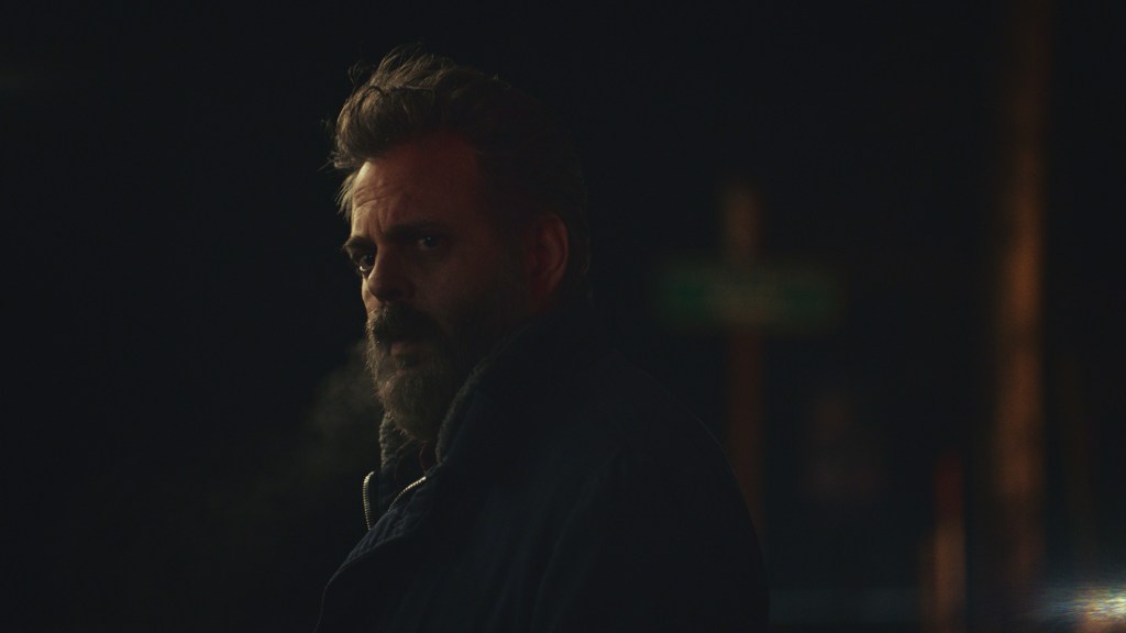 Switching the order of the original tale, Taylor starts out by introducing us to the “Woodsman” (Ivan Martin), a grizzled middle-aged man who lives on his own in a remote, wooded area of Oregon. We first meet the hermit when he’s prowling among the trees with a metal detector searching for—what?